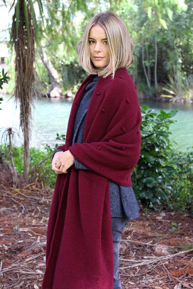 A generously sized wrap/shawl with bobble features. Made from a luxurious blend of 40% Possum, 50% Merino and 10% Nylon.