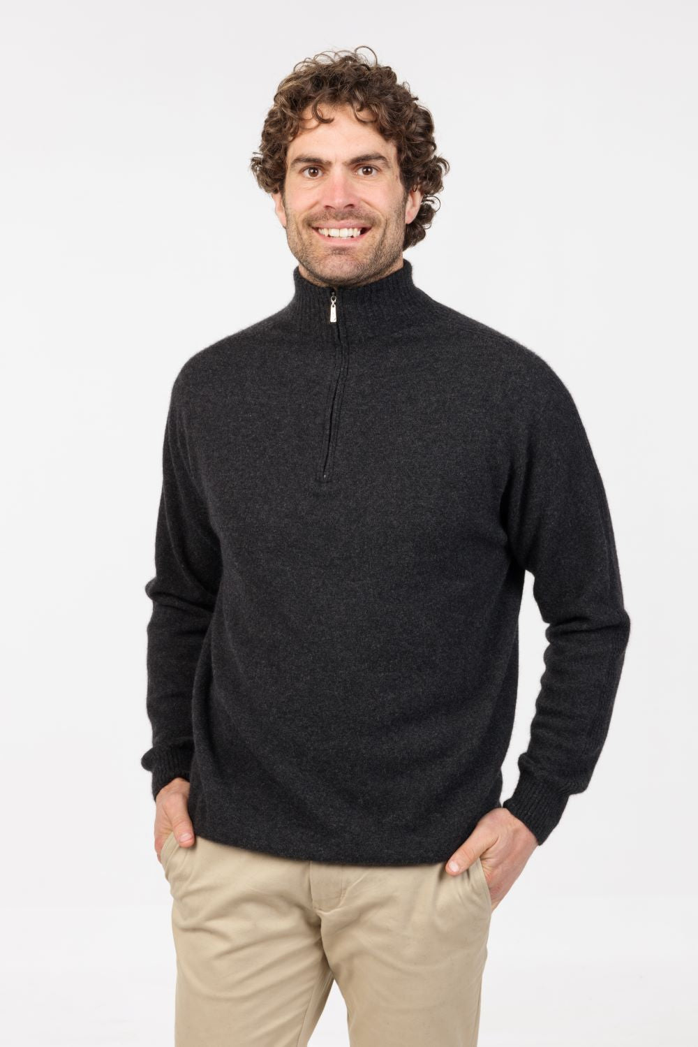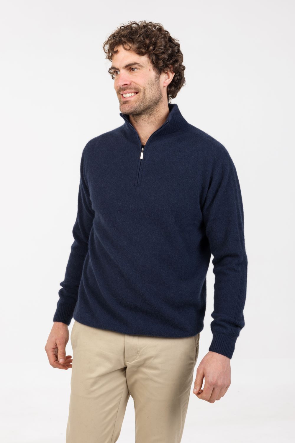Half zip with ribbed detail down sleeve, made from a luxurious blend of 20% Possum, 70% Merino and 10% Silk.
