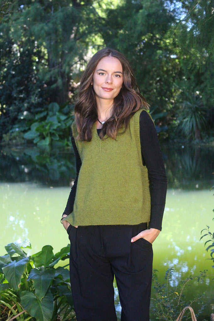 Classic v-neck vest with ribbed drop hem. Overlapping side vents