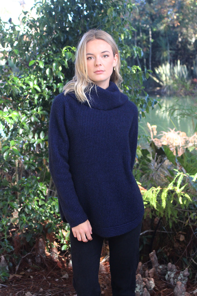 This chunky jumper will keep you warm on the coldest days. Featuring a generous cowl neck and flattering curved hemline this is a feminine take on the chunky fisherman's rib jumper. Made from a luxurious blend of 40% Possum, 50% Merino and 10% Nylon.